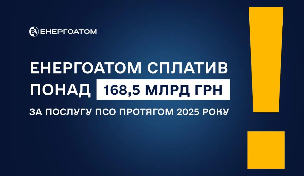 АТ «НАЕК «Енергоатом» покрив 100% вартості послуги ПСО січня-грудня 2025 року. Протягом 2025 року сплачено 168,546 млрд грн (з ПДВ)*. Це на 15 млрд грн більше, ніж роком раніше – у 2024 році Енергоатом сплатив за послугу ПСО 153 млрд 184 млн грн (з ПДВ).