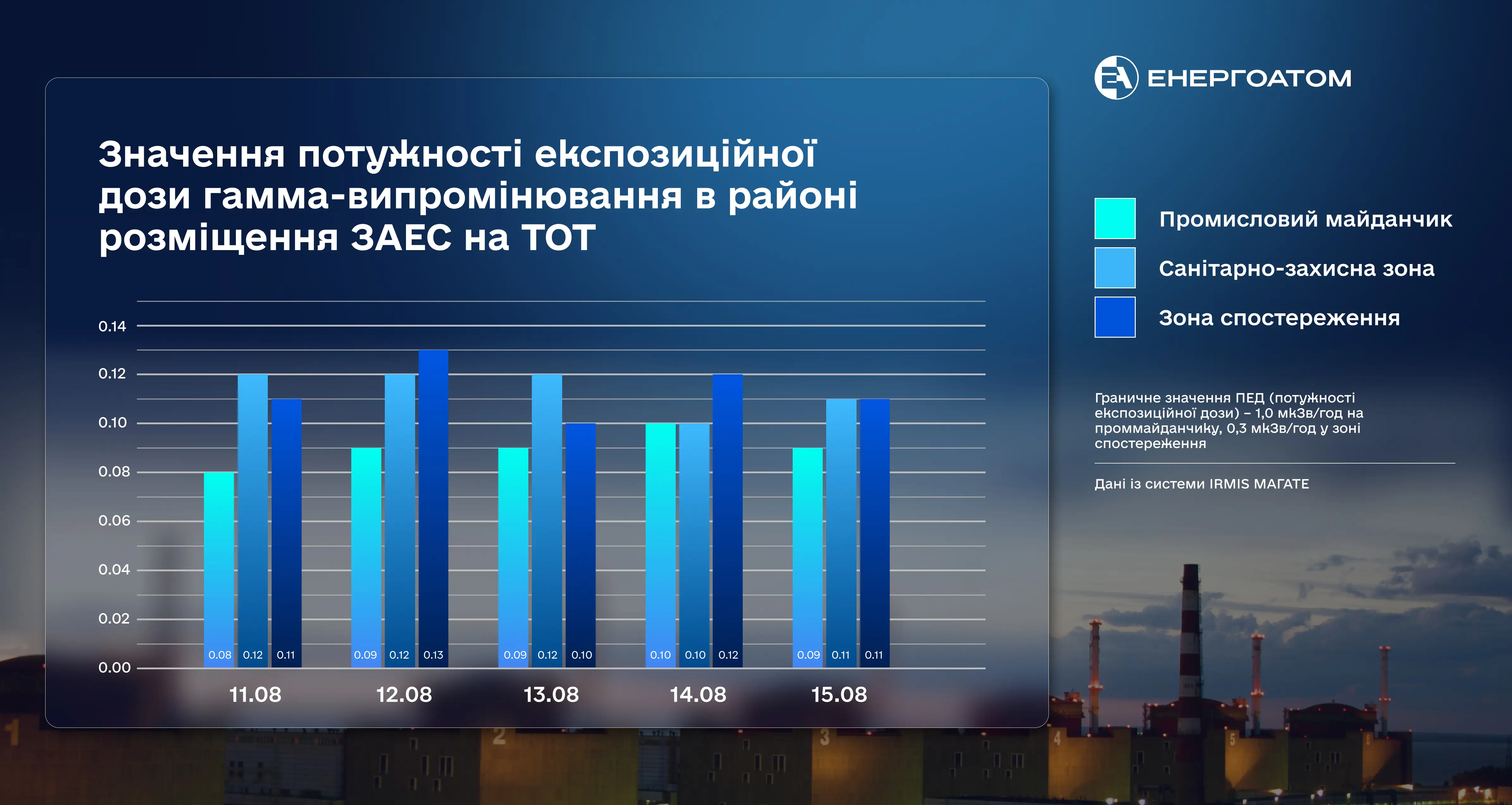 З 11-го серпня по 15 серпня 2025 року потужність експозиційної дози гамма-випромінювання в районі розміщення Запорізької АЕС на тимчасово окупованих територіях України відповідала чинним нормам.