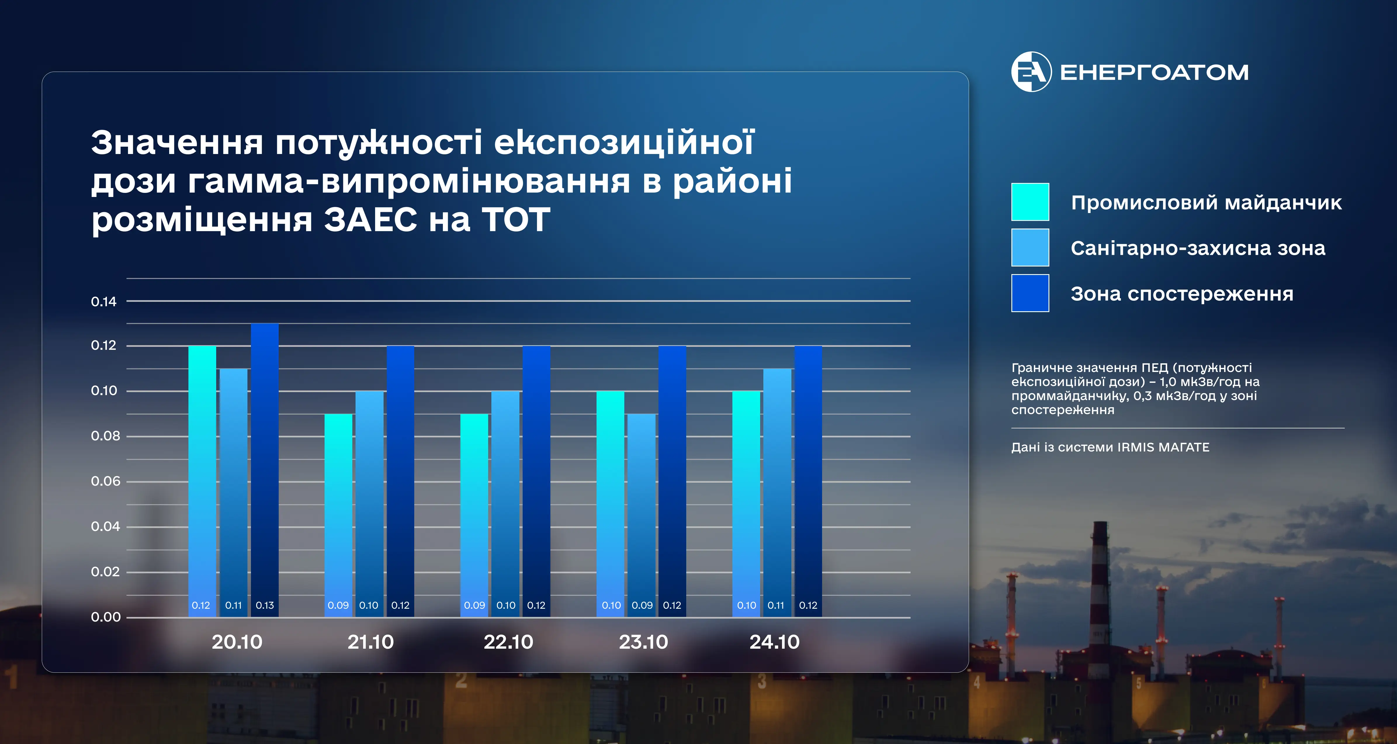 З 20-го жовтня по 24 жовтня 2025 року потужність експозиційної дози гамма-випромінювання в районі розміщення Запорізької АЕС на тимчасово окупованих територіях України відповідала чинним нормам.
